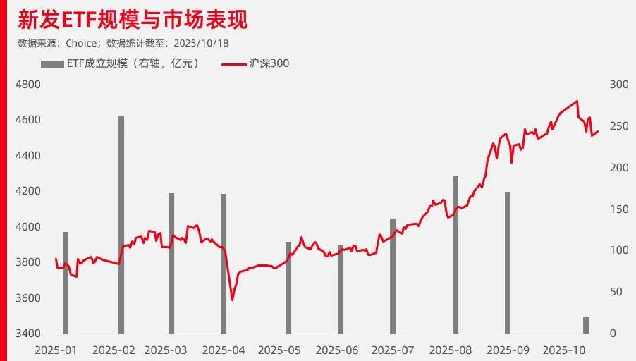 今天虽然A股全天红盘震荡,但是很明显,随着上周的剧烈回调,人气散了不少。 成交额只有1.75万亿出头,创8月初以来新低。 确实,上周的调整,使得各大规模指数都跌到了20日均线下,这一轮行情暂时告一段落,接下来怎么走,看后续的洗盘洗得好 不好了。 所以,尽管不是什么特别的时间节点,我也花时间整理今年的ETF新发情况,看看市场行情与新发ETF间的联系,也给未来的投 资策略多些线索和参考。 01 发行跟着行情走 截至10月18日,今年共有257只股票型ETF成立,发行规模达到1460.14亿元。 放在近10年维度,也是比较高的水平,仅次于2021年。 发行的回暖,当然还得拜行情所赐。 再从这些ETF跟踪的指数风格来看,数量角度管理人们还是更偏爱主题行业类指数,两者占比超40%。 我们把ETF发行规模和数量拆解到每个月,同样与行情息息相关。 年初的DeepSeek时刻,使得即使春节刚刚归来的2月,发行规模达到了261.93亿,而且单只ETF平均规模接近12亿,均为年度高 点。 而四月份的关税巨震,市场恐慌,让五月、六月ETF发行陷入低谷,好在后面的一波慢牛行情,让激情重燃。 | | 2025年股票型ETF发行统计 数 ...