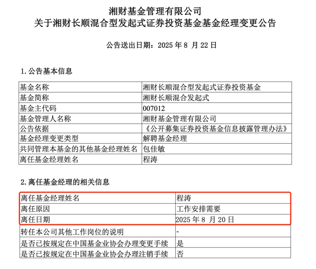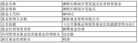 中国经济网北京8月22日讯 今日,湘财基金公告,程涛离任湘财长顺混合发起式、湘财研究精选一 年持有期混合、湘财鑫享债券、湘财长源股票型。 | 基金名称 | 湘财研究精选一年持有期混合型证券投资基金 | | --- | --- | | 基金简称 | 湘财研究精选一年持有期混合 | | 基金主代码 | 016781 | | 基金管理人名称 | 湘财基金管理有限公司 | | 公告依据 | 《公开募集证券投资基金信息披露管理办法》 | | 基金经理变更类型 | 解聘基金经理 | | 共同管理本基金的其他基金经理姓名 | 包住敏 | | 离任基金经理姓名 | 程涛 | | 基金名称 | 湘财鑫享债券型证券投资基金 | | --- | --- | | 基金简称 | 湘财鑫享债券 | | 基金主代码 | 017809 | | 基金管理人名称 | 湘财基金管理有限公司 | | 公告依据 | 《公开募集证券投资基金信息披露管理办法》 | | 基金经理变更类型 | 解聘基金经理 | | 共同管理本基金的其他基金经理姓名 | 包佳敏、刘勇驿 | | 离任基金经理姓名 | 程涛 | | 基金名称 | 湘财长源股票型证券投资基金 | ...