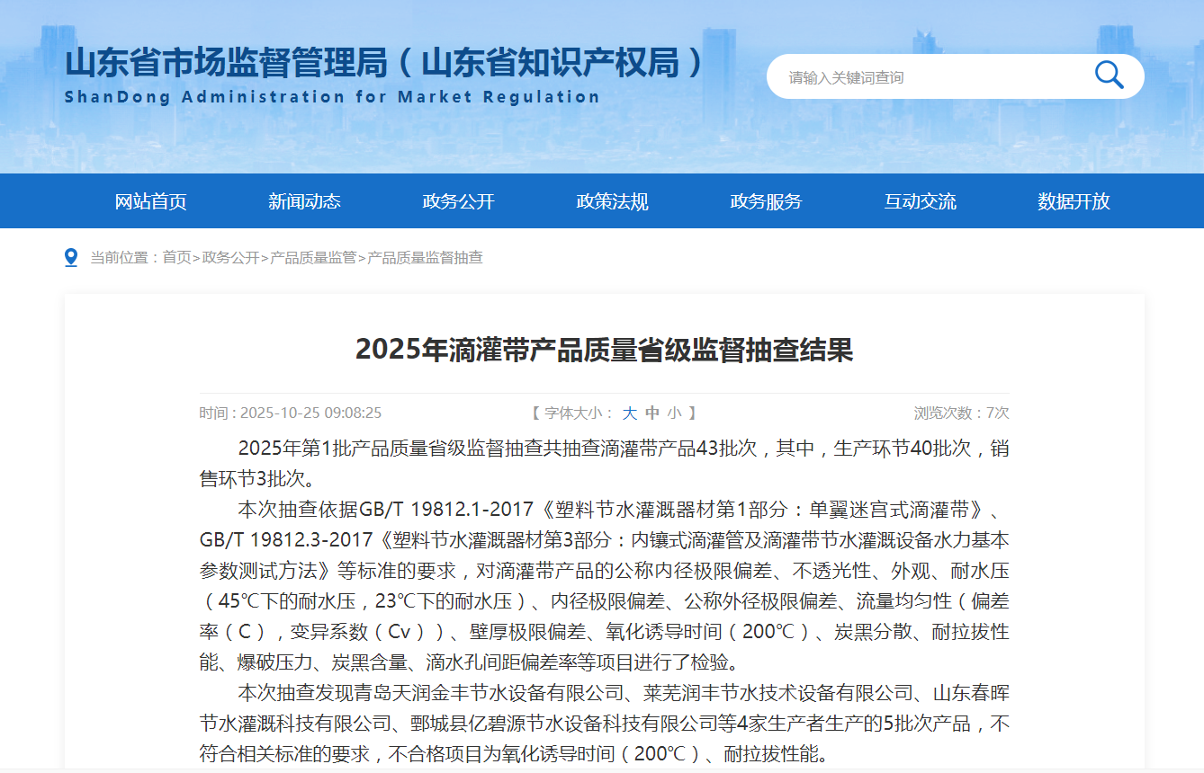 山东省市场监管局发布2025年滴灌带产品质量省级监督抽查结果