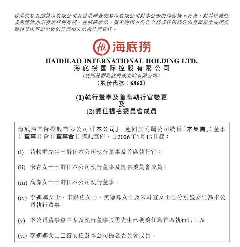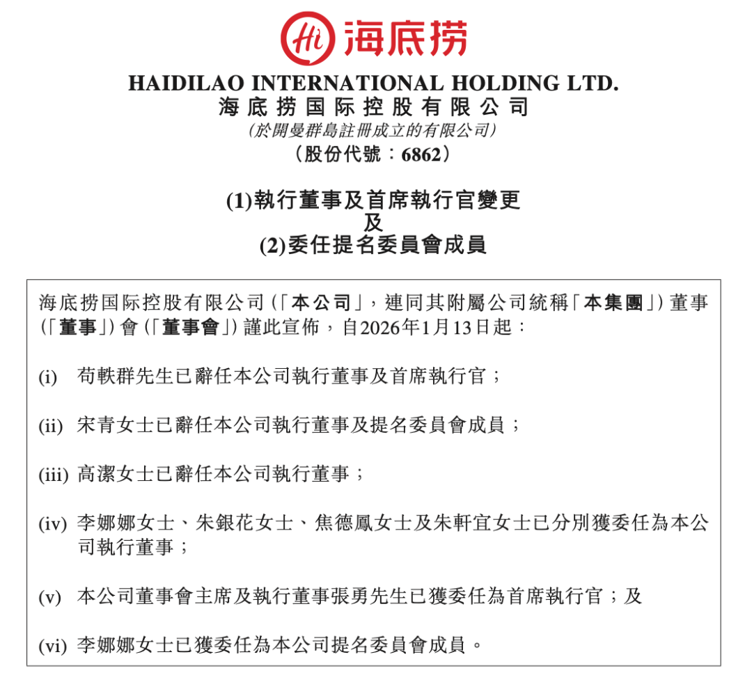 1月13日,海底捞在港交所公告,苟轶群已辞任公司执行董事及首席执行官,基于对公司管理层安排的整体调整及综合考察,董事会主席兼执行董事张勇 已获委任为公司首席执行官,自2026年1月13日起生效。 公告同时提到,宋青已辞任公司执行董事及提名委员会成员;高洁已辞任公司执行董事;李娜娜、朱银花、焦德凤及朱轩宜已分别获委任为公司执行董 事;李娜娜已获委任为公司提名委员会成员。 海底捞表示,上述辞任董事将继续在集团担任重要管理职能,其中,苟轶群辞任首席执行官职务后,将在集团统筹推动管理流程的智能化与自动化规划, 推动运营模式升级和智能中台建设,提升组织管理效率与决策性能;宋青将继续担任集团产品委员会主任一职。 ...