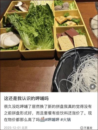 01 更换菜单、调整锅底 已有多个品牌变相涨价 涨价,正在成为行业焦点。 2025年底,麦当劳涨价一事引起外界关注,不少人表示穷鬼套餐不香了。在此之前,杨国福麻辣香锅套餐中绿豆芽28.8元/斤的定价被骂上热搜,新晋网 红茶饮品牌卡旺卡也被网友发现在悄悄涨价,招牌产品手剥大橘从原先的16元上涨至20元。 餐饮寒冬,生意难做,涨价需要不小的勇气。 对于餐饮品牌而言,到底该坚持薄利多销,还是选择涨价保利润呢?这一命题同样萦绕在火锅老板的心头。火锅餐见注意到,目前一些火锅品牌已经用实 际行动给出了自己的回答。 比如呷哺呷哺。曾几何时,它凭借平价火锅的定位打开市场,成为诸多大学生心中的白月光,但近年来的人均消费已逐渐上探至50-60元。近段时间,菜 品又发生一些变化,其经典九宫格拼盘食材从蛋饺、午餐肉等变为普通丸子,被消费者质疑价值缩水,变相提价。 网友吐槽呷哺变贵了 无独有偶,怂火锅在"爆改"过程中,似乎也悄悄地调整了价格体系。 大众点评数据显示,爆改后的怂火锅·焕新(广州丽影广场店)的人均消费为114元,比普通门店高出15-30元。另外,近期多家门店的锅底容量从1/4调整 为1/3,牛油锅底价格随之上涨,虽被解释为 ...