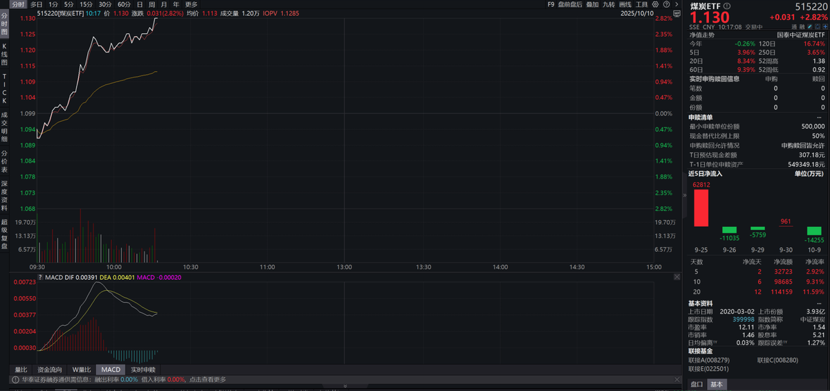 全市场唯一煤炭ETF(515220)涨超1%,近20日净流入超12亿元,资金积极布局煤炭“反内卷”机会