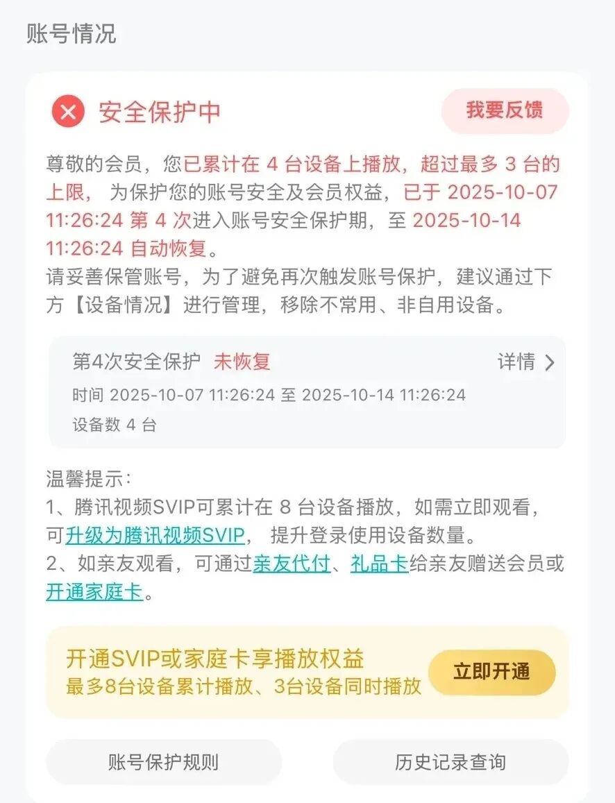 以下文章来源于定焦One ,作者定焦One团队 定焦One . 深度影响创新。 本文来自微信公众号: 定焦One ,作者:陈丹,编辑:魏佳,题图来自:AI生成 又一家视频网站因为会员权益问题被推上风口浪尖。 2025年10月9日,一位网友在社交平台晒出截图称,自己的腾讯视频VIP账号因登录设备数量超出限 制,被平台封禁7天。消息一出, #腾讯视频账号6次超限或面临封号 #的话题冲上热搜第一 。 腾讯视频回应媒体称,此举是为了"打击黑灰产、保护账号安全"。但在不少用户看来,这更像是一场 以"治理"为名的限权行动。这并非腾讯视频首次因"封号"陷入舆论争议,放眼整个长视频行业,爱奇 艺、优酷等平台也屡屡因会员权益问题引发舆情危机。 而在平台的"无奈"与用户的"委屈"之间,是一道不断扩大的裂痕。背后暴露出的,恰恰是整个长视频 行业最难启齿的焦虑:当增长触顶之后,平台如何在"防盗"和"留人"之间取舍? "封号"有理,但不讨喜 要判断腾讯视频"封号"是否有理,需先厘清其设备使用规则与此次事件的具体细节。 对于不同等级会员的设备使用权限,腾讯视频有着不同的限制。 除VIP会员外,级别更高的SVIP会员可登录8台设备、允许3 ...