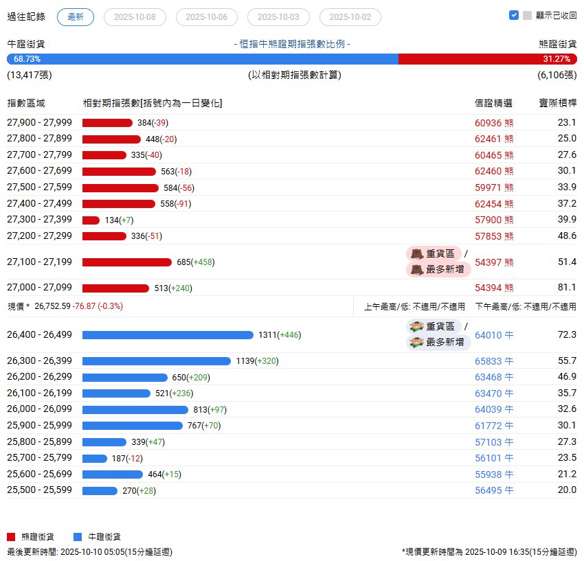| 牛證街貨 | | - 恒指牛熊證期指張數比例 - | | | 熊證街貨 | | --- | --- | --- | --- | --- | --- | | 63.10% | | | | | 36.90% | | (11,107張) | | (以相對期指張數計算) | | | (6,4955長) | | 指數區域 | 相對期指張數[括號內為一日變化] | | | 信證精選 | 實際槓桿 | | 27,400 - 27,499 | 216(+19) | | | 62454 RE | 26.4 | | 27,300 - 27,399 | 119(+44) | | | 60464 BE | 30.4 | | 27,200 - 27,299 | 418(+31) | | | 62451 NE | 33.5 | | 27,100 - 27,199 | 377(+64) | | | 59967 RE | 38.3 | | 27,000 - 27,099 | | 1109(+9) | 車買品 | 56557 BE | 44.1 | | 26,900 - 26,999 | 772(+7) | | | 58924 NE | ...
