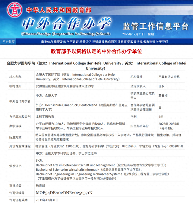学院未来将拓展硕士研究生学历教育,致力于建成一所具备先进教育理念、创新教学模式与成熟管理经 验的高水平合作办学机构,着力培养一批契合经济社会发展需求,兼具国际视野、创新能力与全球竞争 力的智能制造、人工智能领域专业人才。 据悉,合肥大学国际学院由该校与德国奥斯纳布吕克应用科学大学联合举办。奥斯纳布吕克应用科学大 学是德国应用科学大学精英联盟(UAS7)成员高校,与合肥大学已缔结40年合作渊源。 据合肥日报 | 机构名称 | 合肥大学国际学院(德文:International College der Hefei | 机构属性 | 不具有法人资格 | | --- | --- | --- | --- | | | University,英文:International College of Hefei University) | | | | 机构住所 | 安徽省合肥市经济技术开发区锦绣大道99号 | 法定代表人 | 任永 | | 中外合作办学者 | 中方:合肥大学 | 校长或主要行政负 费人 | 葛春梅 | | | 外方:Hochschule Osnabrück, Deutschland (德国奥斯纳布吕克应 | 合 ...