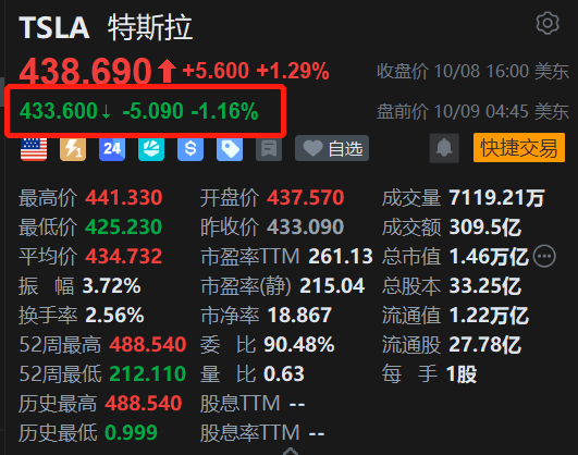 | TSLA 特斯拉 | | | | --- | --- | --- | | 438.690 ↑ +5.600 +1.29% | | 收盘价 10/08 16:00 美东 | | 433.600 ↓ -5.090 -1.16% | | 盘前价 10/09 04:45 美东 | | 三 7 24 华 S 9 月 ♥ 曲 一 曲 | | ● 快捷交易 | | 最高价 441.330 开盘价 437.570 | 成交量 7119.21万 | | | 最低价 425.230 昨收价 433.090 | 成交额 309.5亿 | | | 平均价 434.732 | 市盈率TTM 261.13 总市值 1.46万亿 (m) | | | 振 幅 3.72% | 市盈率(静) 215.04 总股本 33.25亿 | | | 换手率 2.56% 市净率 18.867 | 流通值 1.22万亿 | | | 52周最高 488.540 委 比 90.48% | 流通股 27.78亿 | | | 52周最低 212.110 量 比 0.63 | 包 主 1股 | | | 历史最高 488.540 股息TTM -- | | | | 股 ...