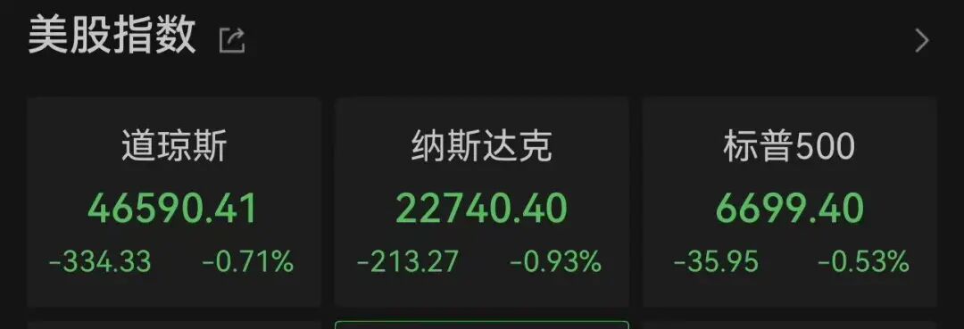 截至收盘,道琼斯指数跌0.71%,报46590.41点;标普500指数跌0.53%,报6699.40点;纳斯达克指数跌0.93%,报22740.40点。 上一交易日,道指创下纪录新高,盘中一度突破47000点,主要受益于可口可乐和3M的强劲业绩。 美东时间周三,随着贸易紧张局势再度升温,三大指数集体收跌,纳指跌近1%,跌幅领跌主要股指。 德州仪器股价周三大跌5.6%,该公司最新财报逊于预期,且第四季度业绩指引同样疲软。 德州仪器的表现拖累了整个半导体板块。安森美下跌近6%,AMD下跌逾3%,美光科技和VanEck半导体ETF均下跌约2%。 奈飞股价同样拖累市场。该流媒体平台因与巴西税务机构的纠纷导致业绩不及预期,股价暴跌10%。 大型科技股多数收跌,英伟达跌0.49%,微软涨0.56%,苹果跌1.64%,谷歌涨0.49%,亚马逊跌1.84%,Meta涨0.02%,甲骨文跌0.90%,博通跌0.69%。 每经编辑|程鹏 毕陆名 | く 厨房 | 知名美股 ○ Q | | --- | --- | | 名称 | 最新 涨幅。 总量 | | 特斯拉 | 438.970 -0.82% 8076万股 | | TSLA | ...
