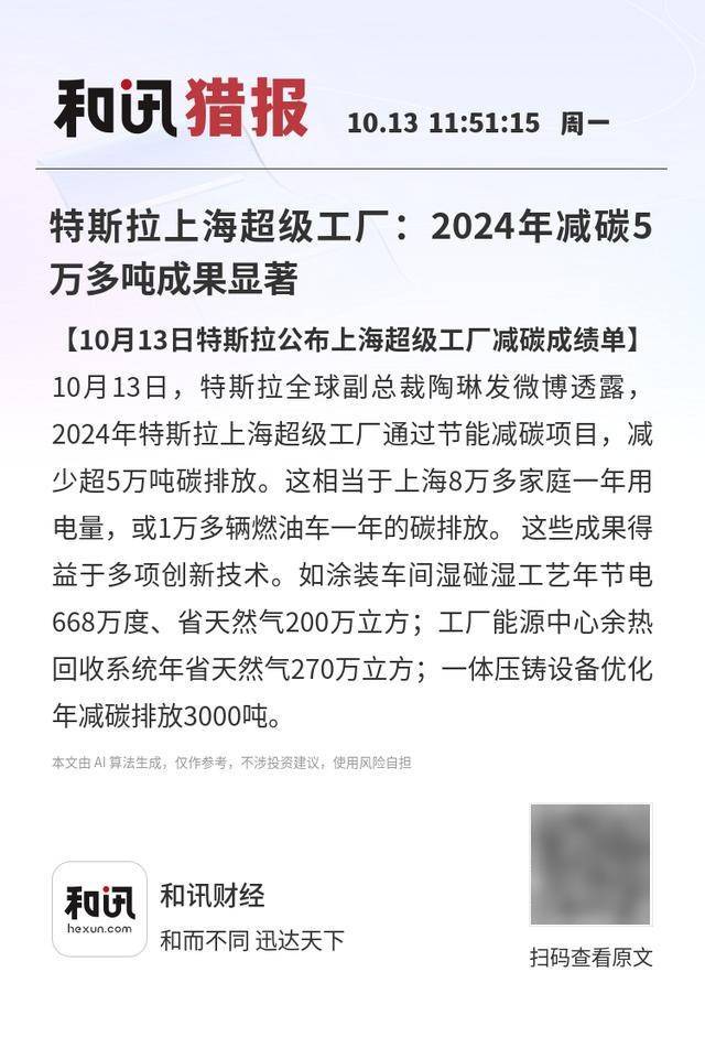 【10月13日特斯拉公布上海超级工厂减碳成绩单】10月13日,特斯拉全球副总裁陶琳发微博透露,2024 年特斯拉上海超级工厂通过节能减碳项目,减少超5万吨碳排放。这相当于上海8万多家庭一年用电量, 或1万多辆燃油车一年的碳排放。 这些成果得益于多项创新技术。如涂装车间湿碰湿工艺年节电668万 度、省天然气200万立方;工厂能源中心余热回收系统年省天然气270万立方;一体压铸设备优化年减碳 排放3000吨。 本文由 AI算法生成,仅作参考,不涉投资建议,使用风险自担 和讯猎报 10.13 11:51:15 周- 特斯拉上海超级工厂:2024年减碳5 万多吨成果显著 【10月13日特斯拉公布上海超级工厂减碳成绩单】 10月13日,特斯拉全球副总裁陶琳发微博透露, 2024年特斯拉上海超级工厂通过节能减碳项目,减 少超5万吨碳排放。这相当于上海8万多家庭一年用 电量,或1万多辆燃油车一年的碳排放。这些成果得 益于多项创新技术。如涂装车间湿碰湿工艺年节电 668万度、省天然气200万立方;工厂能源中心余热 回收系统年省天然气270万立方;一体压铸设备优化 年减碳排放3000吨。 本文由 Al 算法生成,仅作参考,不涉 ...
