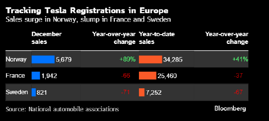 特斯拉以欧洲多国新车销量大幅下降的惨淡光景,为其在欧洲低迷的一年表现画上句号。 据法国汽车协会数据,这家美国企业上月在法国仅注册1942辆汽车,同比下滑66%。瑞典市场方面,特 斯拉12月销量暴跌71%,全年销量降幅达67%。 挪威仍是逆势而上的例外,该公司12月在该市场注册了5,679辆汽车,同比增长近90%。特斯拉在该市 场的受欢迎程度依然不减,去年售出的新车中96%为纯电动汽车。 分析师预计特斯拉将于周五晚些时候公布第四季度全球汽车交付量下滑约11%。本周早些时候,特斯拉 罕见地发布了一份分析师对汽车交付量的平均预期,该数据更为悲观,显示交付量下降15%。 责任编辑:陈钰嘉 特斯拉以欧洲多国新车销量大幅下降的惨淡光景,为其在欧洲低迷的一年表现画上句号。 据法国汽车协会数据,这家美国企业上月在法国仅注册1942辆汽车,同比下滑66%。瑞典市场方面,特 斯拉12月销量暴跌71%,全年销量降幅达67%。 挪威仍是逆势而上的例外,该公司12月在该市场注册了5,679辆汽车,同比增长近90%。特斯拉在该市 场的受欢迎程度依然不减,去年售出的新车中96%为纯电动汽车。 分析师预计特斯拉将于周五晚些时候公布第四季度全 ...