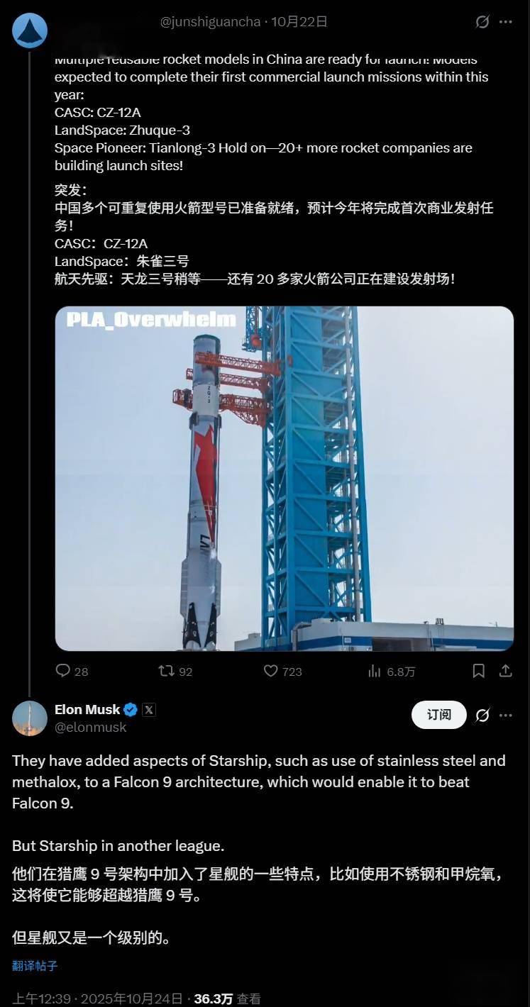 IT之家 10 月 24 日消息,蓝箭航天的可重复使用火箭朱雀三号于本周顺利完成加注合练及静态点火试验,进入首飞关键准备阶段,为今年正式入轨发射及一 级回收开展各项准备。 这一消息传到国外后,SpaceX CEO 埃隆・马斯克今日对此发表评论称: 他们在猎鹰 9 号架构中加入了星舰的一些特点,比如使用不锈钢和液氧甲烷,这将使它能够超越猎鹰 9 号。 但星舰又是另一个级别的。 IT之家注:朱雀三号是一款具备一级重复使用能力的大型液氧甲烷火箭,也是我国面向大型星座组网任务,自主研制的一款大运力、低成本、可重复使用的 液体运载火箭,起飞重量约 570 吨,全箭长度约 66 米,运载能力不小于 18.3 吨,计划今年首飞,可支撑我国卫星互联网组网的高密度发射、大型通信卫星 发射以及各型飞船发射的任务需求。 蓝箭航天表示,后续将按计划开展垂直状态操作演练,随后返回技术区,为正式入轨发射及一子级回收开展各项准备。 ...