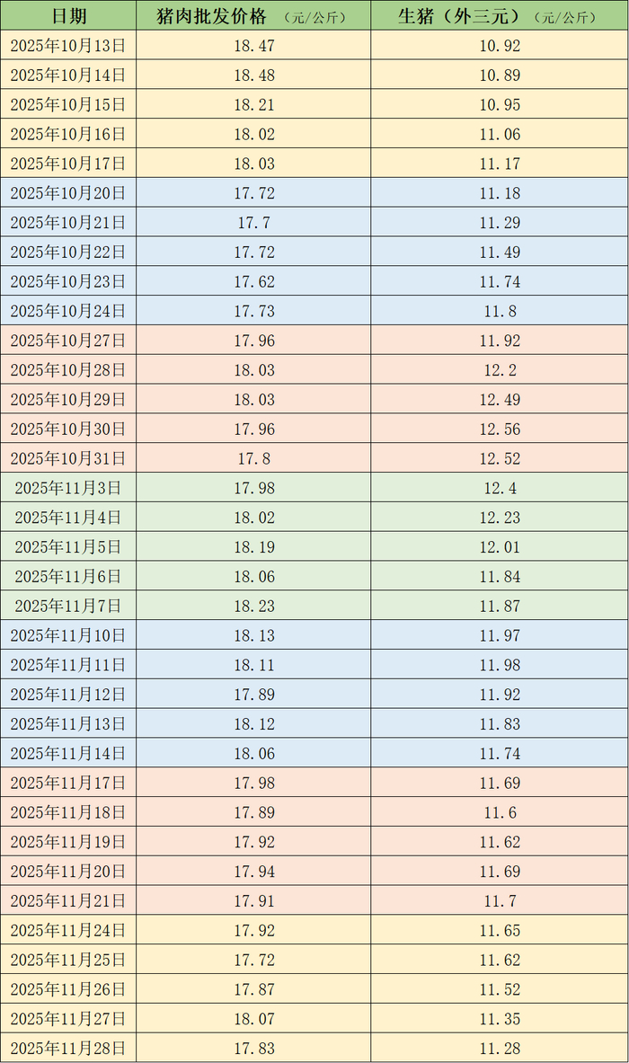 | 近 | | --- | 期的猪肉和生猪价格。制表 智通财经 本周全国生猪交易均重微降。卓创资讯监测全国生猪平均交易体重为124.62公斤,环比微跌0.1%。本周 分省份交易均重以下滑为主。养殖企业月度出栏进度完成滞后而加速出栏,生猪上市节奏加快;且散户 近期以出栏大体重生猪为主,与市场需求存在差异,屠企加大规模场猪源采购量,交易均重跟随小幅度 回落。仅黑吉两地散户大猪出栏增加,而规模场猪源出栏体重偏小,市场需求大猪增加,屠企收购散户 猪源占比提升,均重小涨。本周国内生猪重点屠宰企业开工率小幅上涨,周内平均开工率38.92%,较 上周上涨0.7个百分点。周内养殖端出栏积极性提升,生猪供应充沛,同时气温下降,终端需求略有提 升,南方腌腊零星开启,屠宰企业订单小幅增加,开工率上涨。 据农业农村部监测,11月28日,全国农产品批发市场猪肉平均价格为17.83元/公斤,与上周五(11月21 日)的17.91元/公斤相比,下降0.4%。本周的平均价格为17.88元/公斤,与上周17.93元/公斤的均价相 比,下降0.3%。 本周国内生猪价格呈持续下滑走势,周均价环比下跌。据中国养猪网的数据,11月28日,生猪(外三 ...