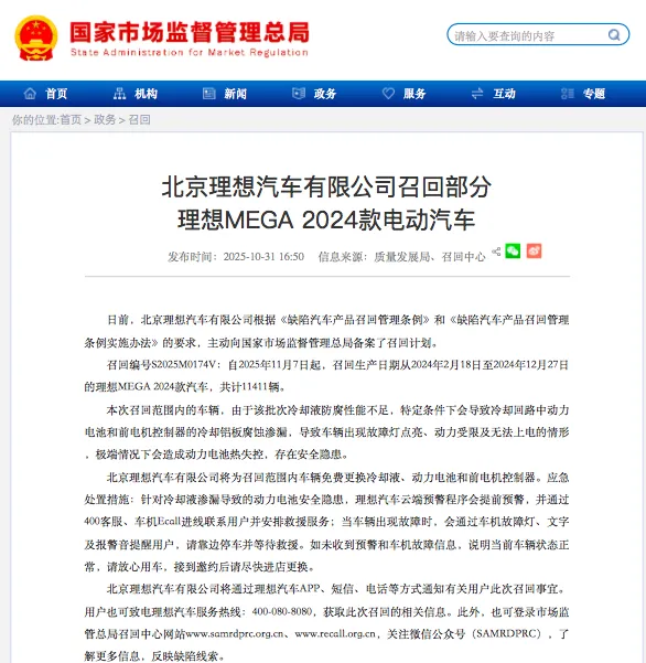 作者丨彭鑫 编辑丨安安 MEGA起火自燃8天后,理想汽车向国家市场监督总局备案了召回计划,召回共计11411辆MEGA电动汽 车。 10月31日,据国家市场监督总局官网显示,日前,北京理想汽车有限公司根据《缺陷汽车产品召回管理 条例》和和《缺陷汽车产品召回管理条例实施办法》的要求,主动向国家市场监督管理总局备案了召回 计划。 图源:国家市场监督管理总局官网 召回编号S2025M0174V:自2025年11月7日起,召回生产日期从2024年2月18日至2024年12月27日的理 想MEGA 2024款汽车,共计11411辆。 本次召回范围内的车辆,由于该批次冷却液防腐性能不足,特定条件下会导致冷却回路中动力电池和前 电机控制器的冷却铝板腐蚀渗漏,导致车辆出现故障灯点亮、动力受限及无法上电的情形,极端情况下 会造成动力电池热失控,存在安全隐患。 北京理想汽车有限公司将为召回范围内车辆免费更换冷却液、动力电池和前电机控制器。应急处置措 施:针对冷却液渗漏导致的动力电池安全隐患,理想汽车云端预警程序会提前预警,并通过400客服、 车机Ecall进线联系用户并安排救援服务;当车辆出现故障时,会通过车机故障灯、文字及报警 ...