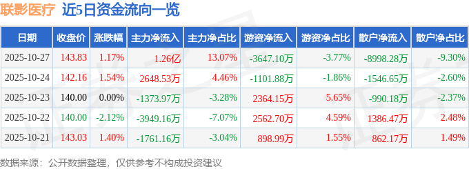 股票行情快报:联影医疗(688271)10月27日主力资金净买入1.26亿元