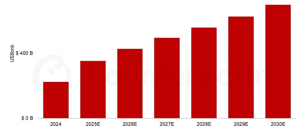 以下文章来源于Counterpoint 咨询 ,作者Counterpoint Counterpoint 咨询 . Counterpoint Research 是一家专注于科技行业的全球性研究公司,在全球主要的市场有着强大的影响 力。我们致力于为合作伙伴提供准确、及时的市场数据,帮助他们做出明智的决策。 全球 AI 消费支出 来源:Counterpoint Research 根据 Counterpoint Research 最新发布的《全球 AI 消费支出预测(2024–2030)》报告 ,消费者在 生成式 AI 领域的支出正加速重塑全球科技产业格局。该报告于 2025 年 11 月 23 日发布,指出无论 是面向消费者的 AI 软件,还是其运行所需的硬件设备,未来几年内都将迎来快速增长。 从结构来看,AI 硬件仍将占据整体消费支出的最大比重。推动这一增长的核心动力在于 AI 功能在 个人终端设备中的集成。报告预测,2023 至 2030 年间,全球生成式 AI 智能手机出货量将以 26% 的复合年增长率增长,相应收入的复合年增长率为 16%。 研究总监 Marc Einstein 表示:"未来几年AI 硬件支 ...