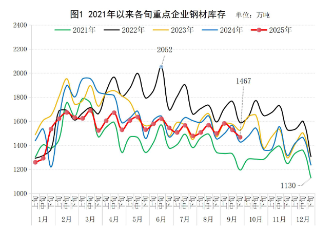 新华财经北京10月10日电中国钢铁工业协会10日发布数据,2025年9月下旬,重点统计钢铁企业共生产 粗钢1889万吨,平均日产188.9万吨,日产环比下降8.9%;生铁1817万吨,平均日产181.7万吨,日产环 比下降4.9%;钢材2142万吨,平均日产214.2万吨,日产环比增长4.0%。 据此估算,本旬全国日产粗钢234万吨、环比下降8.9%(见图1),日产生铁218万吨、环比下降4.9%, 日产钢材414万吨、环比下降0.7%。 分地区来看,9月下旬六大地区中,除东北地区重点统计企业粗钢日产量较上一旬有所增长外,其它地 区均有不同程度下降。 同期发布的库存数据显示,2025年9月下旬,重点统计钢铁企业钢材库存量1467万吨,环比上一旬减少 62万吨,下降4.1%;比年初增加230万吨,增长18.6%;比上月同旬减少31万吨,下降2.1%;比去年同 旬增加39万吨,增长2.7%,比前年同旬减少58万吨,下降3.8%。 (文章来源:新华财经) ...