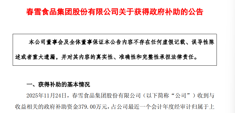 鲁股观察 | 春雪食品再获政府补助379万,年内累计516.53万