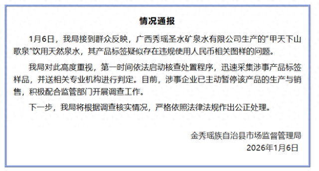 【#官方通报矿泉水标签印人民币图样#】#疑用人民币图样矿泉水已停产#广西金秀瑶族自治县市场监督 管理局1月6日通报:1月6日,我局接到群众反映,广西秀瑶圣水矿泉水有限公司生产的"甲天下山歌 泉"饮用天然泉水,其产品标签疑似存在违规使用人民币相关图样的问题。我局对此高度重视,第一时 间依法启动核查处置程序,迅速采集涉事产品标签样品,并送相关专业机构进行判定。目前,涉事企业 已主动暂停该产品的生产与销售,积极配合监管部门开展调查工作。下一步,我局将根据调查核实情 况,严格依照法律法规作出公正处理。 ...