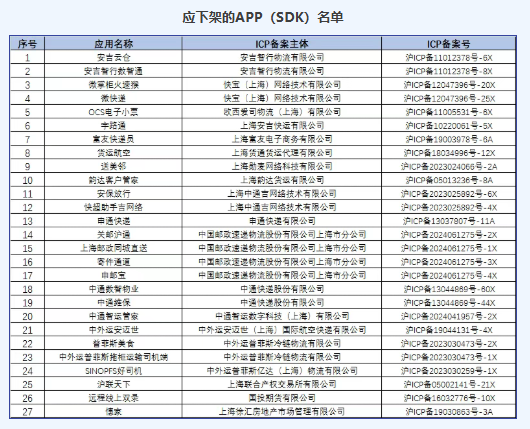 通报称,依据《个人信息保护法》《网络安全法》《电信条例》《电信和互联网用户个人信息保护规定》等法 律法规,根据中央网信办、工业和信息化部、公安部、市场监管总局等四部门联合发布的《关于开展2025年个 人信息保护系列专项行动的公告》要求,上海市通信管理局对APP(SDK)违法违规收集使用个人信息等问题 开展治理。2025年10月,上海市通信管理局向社会公示了一批存在侵害用户权益行为的APP(SDK)。在规定 的整改期限内,经核查复检,尚有韵达客户管家、申通快递、上海邮政同城、货运航空、微快递等27款APP (SDK)未按照要求落实整改,现对上述APP(SDK)采取下架处理。 上海市通信管理局在通告中表示,将对上述APP(SDK)持续跟踪,视情况进一步采取停止接入、行政处罚、 纳入电信业务经营不良名单等处理措施。 上海市通信管理局11月3日发布通报,对27款APP(SDK)采取下架处理。 上海市通信管理局供图 智通财经记者 俞凯 上海市通信管理局11月3日发布通报,对27款APP(SDK)采取下架处理。 | 序号 | 应用名称 | ICP备案主体 | ICP备案号 | | --- | --- | --- | -- ...