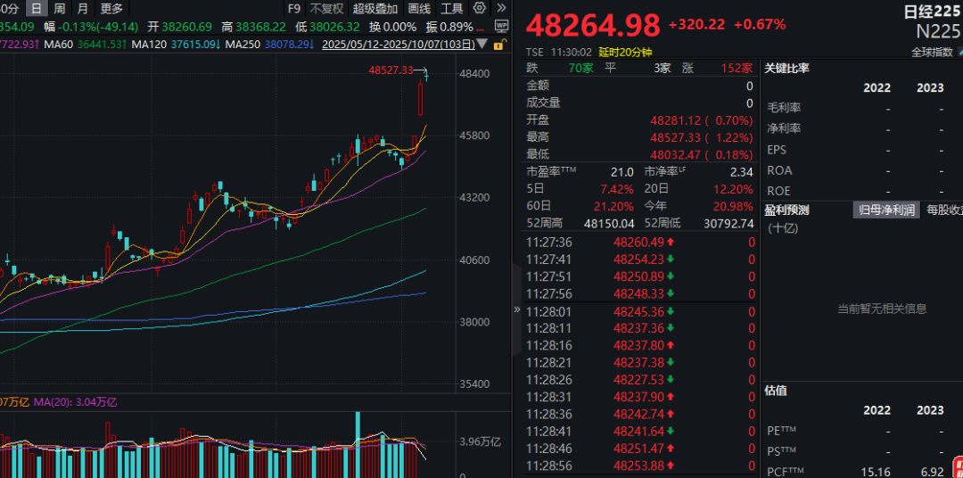 日本股市上行,盘中再创历史新高!日元汇率走低