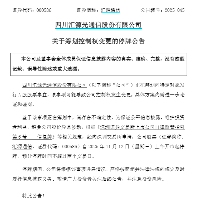 Core Viewpoint - Huyuan Communication (000586) announced a suspension of trading due to plans for a private placement of A-shares, which may lead to a change in control of the company. The suspension will start from November 12 and is expected to last no more than two trading days [1]. Group 1: Company Announcement - Huyuan Communication is planning to issue A-shares to specific investors, which could result in a change of control [1]. - The specific details of the plan are still under further verification and negotiation [1]. - Trading of the company's stock will be suspended starting November 12, with an expected duration of no more than two trading days [1]. Group 2: Business Overview - Huyuan Communication's main business includes power optical cables and online monitoring of power systems [3]. - The company is involved in the research, manufacturing, and sales of various products, including special optical cables for power systems, prefabricated optical cables, online monitoring devices for power equipment, and related components [3]. Group 3: Financial Performance - In the first three quarters of the year, Huyuan Communication achieved a revenue of 361 million yuan, representing a year-on-year growth of 30.37% [4]. - The net profit attributable to shareholders was approximately 14.76 million yuan [4]. - Key financial metrics include: - Revenue for the reporting period: 125.27 million yuan, up 9.04% year-on-year [5]. - Net profit attributable to shareholders: 6.19 million yuan, an increase of 86.74% [5]. - Basic earnings per share: 0.0320 yuan, up 87.13% [5]. - Total assets at the end of the reporting period: approximately 612.88 million yuan, an increase of 8.45% from the previous year [5].