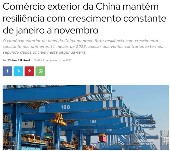 【环球网财经综合报道】海关总署日前发布数据显示,2025年前11个月,我国货物贸易进出口总值 41.21万亿元人民币,同比增长3.6%。其中,出口24.46万亿元,增长6.2%;进口16.75万亿元,增长 0.2%。11月份,我国货物贸易增速回升,进出口总值3.9万亿元,增长4.1%。其中,出口2.35万亿元, 增长5.7%;进口1.55万亿元,增长1.7%。 报道还提到,前11个月,中国外贸结构继续优化,机械设备和电器电子产品出口增长8.8%,占出口总 值比重的60.9%,集成电路和汽车成为主要拉动力;特别是民营企业成为拉动外贸增长的主要动力,进 口、出口总值分别增长7.1%至23.52万亿元人民币,占全国比重的57.1%。 《巴西商业价值报》发文称,面对外部环境复杂严峻,中国货物进出口保持强劲韧性,全年进口、出口 总体继续保持稳定增长;东盟继续保持中国最大贸易伙伴地位,双边贸易额同比增长8.5%,达6.82万亿 元人民币,占中国外贸总额的16.6%。 ...