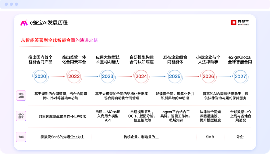 当人们提起e签宝,脑海中浮现的是否仍是那个"在线点个手印、完成电子签字"的工具? 这一印象虽源于其早期身份,却早已无法承载这家企业23年沉淀与进化的真实价值。 事实上,e签宝始终站在技术浪潮与商业信任变革的交汇点上,完成了三次关键跃迁:从2002年写下中 国首行商用电子签名代码、推出国内首款电子印章软件,到2014年率先发布电子签名SaaS平台引领行 业上云,再到今天以自研AI大模型和智能体为核心引擎,全面构建"数字信任基础设施"。 当初的"电子签名"已从功能性的签署工具,蜕变为支撑现代商业社会高效、安全、可信运行的操作系 统。 尤其是生成式AI重塑千行百业的当下,e签宝不再只是合同流程的执行者,而是信任关系的定义者、风 险治理的参与者与全球合规的连接者。 AI技术内核,构筑难以逾越的护城河 在人工智能从通用走向垂直、从感知迈向认知的时代浪潮中,e签宝的AI技术内核并非依赖调用开源大 模型,而是源自于23年深耕合同这一高复杂度法律场景所锻造出的一套闭环、自研、持续进化的智能体 系。 这套体系的核心竞争力,首先体现在其独一无二的数据资产与工程能力上。e签宝从超过2400亿次真实 签署、审查、修改与履约行为中沉淀 ...