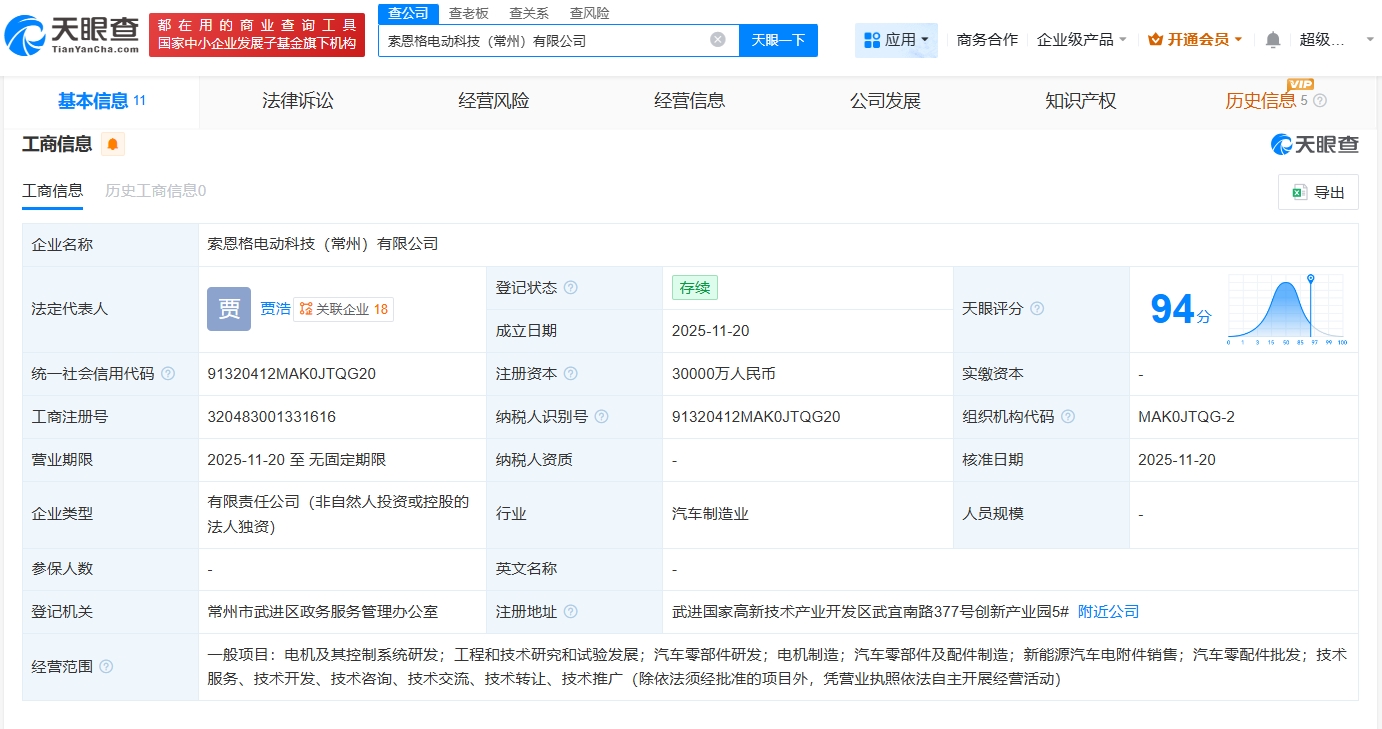 (文章来源:每日经济新闻) | | 更公司 都在用的 商业查询 工具 | 查老板 查关系 查风险 | | | | | --- | --- | --- | --- | --- | --- | | | 国家中小企业发展子基金旗下机构 | 素恩格电动科技(常州)有限公司 | (×) 天眼一下 | 18 应用 · 商务合作 企业级产 | | | 基本信息 11 | 法律诉讼 | 经营风险 | 经营信息 | 公司发展 | 知识产 | | 工商信息 ● | | | | | | | 工商信息 历史工商信息0 | | | | | | | 企业名称 | 索恩格电动科技(常州)有限公司 | | | | | | 法定代表人 | 博 贾浩 签关联企业 18 | 登记状态 ② | 存续 | | 天眼评分 2 | | | | 成立日期 | 2025-11-20 | | | | 统一社会信用代码 2 | 91320412MAK0JTQG20 | 注册资本 ⑦ | 30000万人民币 | | 实缴资本 | | 工商注册号 | 320483001331616 | 纳税人识别号 ⑦ | 91320412MAK0JTQG20 | | 组织机构代码 ...