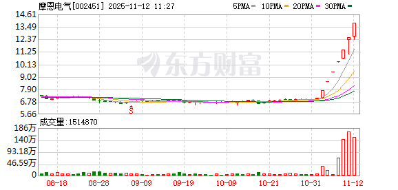 Core Points - Moen Electric has experienced a significant stock price increase, achieving a cumulative rise of 95.06% over the past seven trading days, with a current price of 13.81 yuan [2] - The stock has recorded a high turnover rate of 134.55% during this period, indicating strong trading activity [2] - The company's latest market capitalization is approximately 60.86 billion yuan, with a circulating market value of 60.65 billion yuan [2] Trading Data - As of November 11, the stock's margin trading balance is 171 million yuan, with a financing balance of 170 million yuan, reflecting a 30.81% increase from the previous trading day [2] - The stock has been featured on the Dragon and Tiger list three times due to significant price deviations and turnover rates [2] - Institutional investors have net bought 76.54 million yuan, while total net selling from brokerage seats amounts to 166 million yuan [2] Financial Performance - For the first three quarters, the company reported a revenue of 1.238 billion yuan, representing a year-on-year growth of 28.02% [2] - The net profit for the same period was 7.05 million yuan, showing a decline of 40% year-on-year [2] - The basic earnings per share are reported at 0.0160 yuan, with a weighted average return on equity of 0.92% [2]
