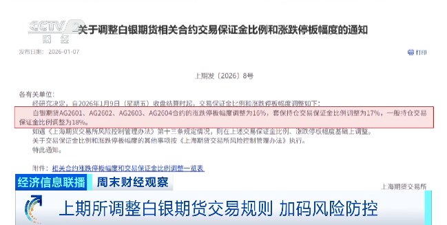 来源:央视财经 开年以来,白银期货价格高位波动,沪银期货主力合约大幅上涨。上海期货交易所发布通知,调整了白 银期货交易规则。 国泰君安期货研究所首席咨询师 陶金峰:今年元旦以来,国内的白银期货 ,(截至1月9日收盘)目前 涨幅是超过9%,接近10%,而且(1月7日)再创上市以来的新高。国际的白银期货也是再创上市以来 新高,整体上还是在高位的、偏强的运行状态。 交易保证金比例则根据套保持仓和一般持仓,分别调整为17%和18%。 据了解,近期相关标准已进行多次调整。 卓创资讯贵金属分析师 黄加奇:本轮调整是整体将保证金和涨跌停板上调了1个百分点。扩涨跌停板是 考虑到当前市场不确定性或造成振幅的扩大,而本身白银外盘无论是伦敦现货还是纽约期货,都不设有 涨跌停板,进而避免极端行情下国内盘面的跳空。 业内人士表示,全球范围内白银价格的大幅波动带来了市场投机氛围的升温。 根据上海期货交易所最新政策调整,自1月9日收盘起, 白银期货合约的涨跌停板幅度调整为16%; 白银贸易商向记者表示,自去年十月份以来,部分买家加价购买,市场出现阶段性抢购行情。随着国内 外白银交易政策的密集出台,近几个交易日,白银期货交易波动依然较大,但 ...