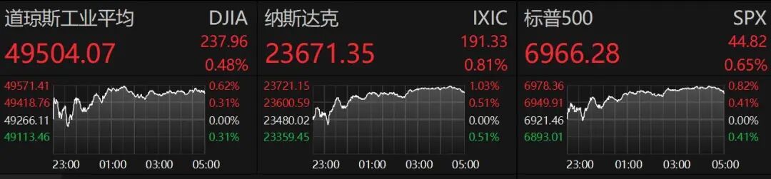 个股方面,英特尔大涨10.8%。据报道,特朗普周五与英特尔CEO陈立武进行会谈,会后直言双方达成了"非常棒的交易",高调宣称美国政府的这笔投 资"非常成功"。 特斯拉涨超2%,Meta涨逾1%,苹果、微软、谷歌、亚马逊小幅上涨;奈飞跌超1%,英伟达小幅下跌。苹果结束日线7连跌。 热门中概股走势分化,纳斯达克中国金龙指数跌1.3%。亚朵跌超5%,奇富科技跌逾3%,小鹏汽车、唯品会等跌超2%,贝壳、携程网等跌超1%;霸王茶 姬、传奇生物涨超2%,哔哩哔哩、百度等涨逾1%。 隔夜美股盘中拉升。黄金、白银、国际油价全线大涨。事关美联储降息,又传出大消息。 1月9日,美股三大指数集体收涨,纳指涨0.81%,标普500指数涨0.65%,道指涨0.48%。其中,道指、标普500指数均创历史收盘新高。 国际原油期货结算价收涨超2%。WTI原油期货2月合约收涨2.35%;布伦特原油期货3月合约收涨2.18%。 消息面上,美国2025年12月非农就业人数增加5万低于预期,失业率降至4.4%低于预期。分析称,非农就业报告显示劳动力市场略有放缓但保持稳定,可 能引导美联储在今年晚些时候降息。 不过据美联储官员表态,美联储降息预期又生 ...