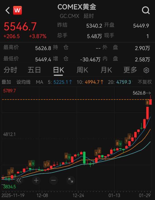 伦敦现货黄金、COMEX期货黄金盘中首次突破5500美元/盎司大关,刷新历史纪录。其中,COMEX期 金最高触及5626.8美元/盎司,伦敦现货黄金也一度逼近5600美元/盎司。白银现货、COMEX白银盘中均 突破119美元/盎司,刷新历史纪录。 数据来源:Wind 中新网1月29日电(记者 张乃月)1月29日,国际金、银价格再创纪录。 道明证券大宗商品策略主管巴特·梅莱克还指出,美联储主席的人选也将是决定今年黄金走势的关键因 素。其认为,下一任美联储主席可能会更加鸽派。 当地时间28日,美联储结束了为期两天的货币政策会议,宣布将联邦基金利率目标区间维持在3.5%至 3.75%之间不变。 新加坡华侨银行分析师称,"黄金不在仅被用来对冲危机或通货膨胀,它越来越被视为一种中性的、可 靠的价值储存工具,可能在更广泛的宏观经济环境下用于多元化投资。" 彭博社还指出,上周日本债券市场的大规模抛售,反映出市场对日本巨额财政支出担忧。同时有关美国 可能干预汇市以支撑日元的猜测也令美元承压,使得贵金属对大多数买家来说更为便宜。 据彭博社统计,随着投资者纷纷押注贵金属,国际金价今年迄今已飙升超过25%;白银的涨幅更大,接 近6 ...