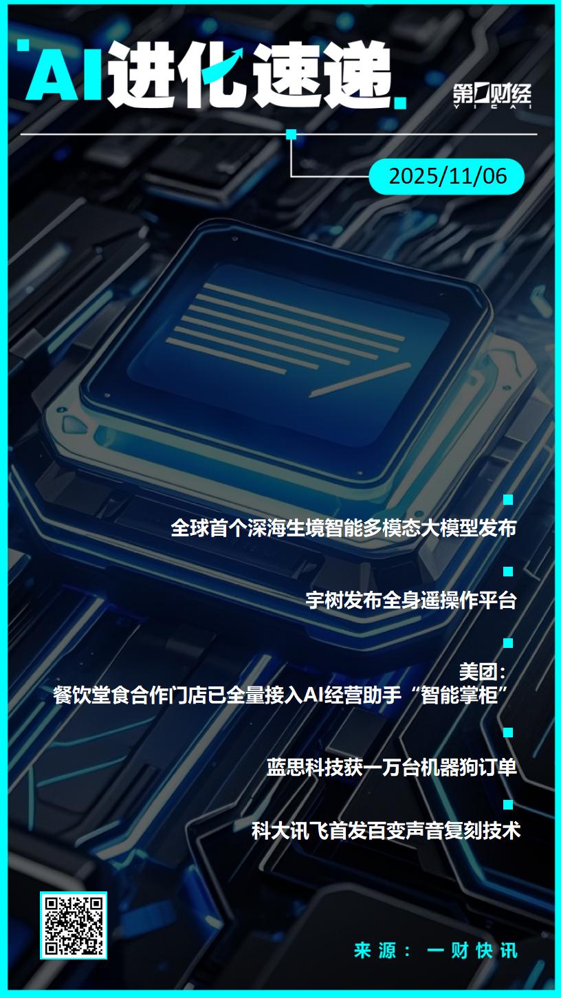 全球首个深海生境智能多模态大模型发布;宇树发布全身遥操作平台;美团:餐饮堂食合作门店已全量接入AI经营 助手"智能掌柜"。 ⑤科大讯飞首发百变声音复刻技术。 餐饮堂食合作门店已全量接入AI经营助手 "智能掌柜" ①全球首个深海生境智能多模态大模型发布; ②宇树发布全身遥操作平台; ③美团:餐饮堂食合作门店已全量接入AI经营助手"智能掌柜"; ④蓝思科技获一万台机器狗订单; 万台机器狗订单 蓝思科技获- 科大讯飞首发百变声音复刻技术 ■ 345 I 456 Ex 来源: 一 财 快 讯 ...