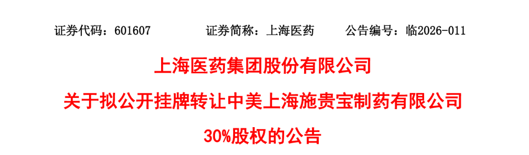 2月4日,上海医药披露公告称,拟通过产权交易所以公开挂牌方式,转让其持有的中美施贵宝30%的股 权,挂牌转让价格不低于10.23亿元。 目前,中美施贵宝的股权由三方持有,其中百时美施贵宝(中国)投资有限公司持股60%,上海医药持 股30%,国药集团资产管理有限公司持股10%。若此次顺利转让,上海医药将不再持有中美施贵宝股 权。 资料显示,中美施贵宝成立于1982年,是我国最早一批中外合资制药企业,公司专注于抗肿瘤、心血 管、抗病毒等领域的处方药研发、生产与销售,引进并本地化生产博路定、百服咛等多款知名原研药。 但受集采和竞争影响,中美施贵宝的业绩持续下滑,2024年实现营收17.95亿元、净利润2.48亿元。2025 年前三季度营收降至10.96亿元、净利润为8711.89万元,较2016年营收47.24亿元、净利润6.22亿元的峰 值均大幅缩水。 实际上,上海医药近年一直在推进资产优化整合。去年4月,上海医药斥资近10亿元进一步控股和黄药 业,获得了"麝香保心丸"等多个中药产品。并且,还通过旗下的上药云健康平台收购多家DTP药房企 业。 研发方面,上海医药也在不断加大投入。2025年前三季度累计研发投入17 ...