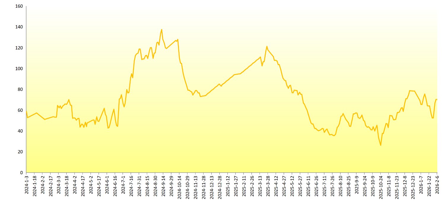 新华财经北京2月14日电 (韩燕)新华-中国(海南·澄迈)香蕉系列价格指数显示,2026年2月2日至2026年2月6日,新华-中国香蕉产地价格指数、新华-中国 (海南)皇帝蕉产地价格指数和新华-香蕉销地批发价格指数环比上涨,新华-进口香蕉价格指数环比持平。 新华-中国香蕉产地价格指数 图1 新华-中国香蕉产地价格指数(单位:点) 数据来源:新华财经数据库 2月6日,新华-中国香蕉产地价格指数报70.19点,较1月30日上涨17.72点,涨幅33.77%;较基期(2017年7月3日)下跌29.81点,跌幅29.81%。 本期(2月2日到2月6日),海南产区统货均价约为1.70元/斤,较前一期(1月26日到1月30日)上涨0.37元/斤,涨幅27.54%;云南产区香蕉卖完,无价格 记录;广西产区统货均价约为1.67元/斤,较前一期(1月26日到1月30日)上涨0.44元/斤,涨幅29.33%。 回顾2025年,新华-中国香蕉产地价格指数呈"升-降-升-降-反弹"波动:2-4月,海南冬春蕉、广西早春蕉、云南山地蕉错峰供应,叠加春节后需求回暖及产区 寒潮致供给偏紧,价格快速攀升,预判此轮涨势将延续至海南蕉上市尾声。4 ...