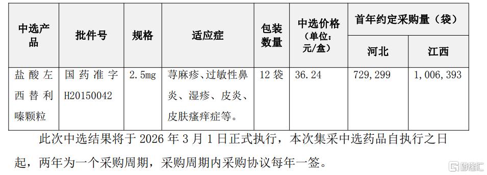 格隆汇1月26日丨康芝药业(300086.SZ)公布,近期参加河北省牵头京津冀赣化学药品集中带量采购(文件编号HBYPJC-2025-05)申报工 作,公司产品盐酸左西替利嗪颗粒中选本次集中带量采购。 | 中选产 品 | 批件号 | 规格 | 适应症 | 包装 数量 | 中选价格 (单位: | 首年约定采购量(袋) | | | --- | --- | --- | --- | --- | --- | --- | --- | | | | | | | 元/盒) | 河北 | 江西 | | 盐酸左 | 国药准字 | 2. 5mg | 等麻疹、过敏性鼻 | 12 袋 | 36. 24 | 729, 299 | 1, 006, 393 | | 西替利 | H20150042 | | 炎、湿疹、皮炎、 | | | | | | 咳颗粒 | | | 皮肤瘙痒症等。 | | | | | ...