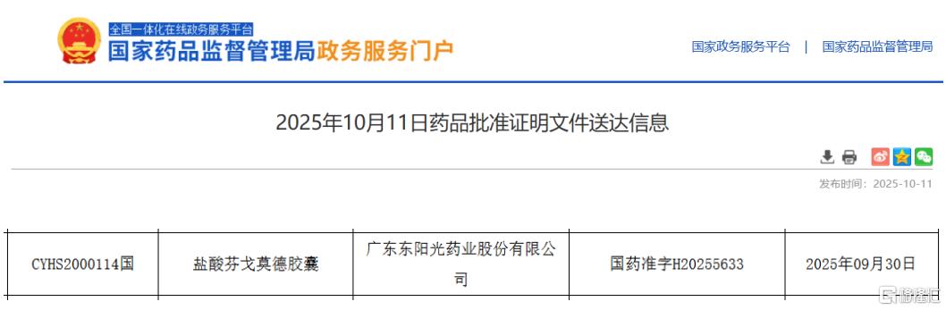 芬戈莫德是诺华从日本Mitsubishi制药引进的药物,在2010年9月在美获批,成为首个可经口服给药的用于复发缓解型多发性硬化症的治疗,是同类药物中首 个可口服的新型免疫抑制剂。盐酸芬戈莫德胶囊被纳入国家第一批临床急需药品名单,原研在2019年获批进入中国市场,随后在2020年进入国家医保谈判目 录,现为2024版国家医保常规目录品种。 芬戈莫德上市初期,全球市场表现不错。2018年超33亿美元的销售成绩。据摩熵医药数据库显示,该药品在2024年全球市场的销售额超5亿美元。 10月11日,据中国国家药品监督管理局(NMPA)官网最新公示,广东东阳光药业按化药注册分类申报的盐酸芬戈莫德胶囊获批上市,并拿下国内首仿。目 前,东阳光药业是该产品首家申报仿制上市并获批的国内药企,同时也是该公司首款口服免疫抑制剂。 | 截 | | --- | 图来源:NMPA | 盐酸芬戈莫德胶囊 | | | | | --- | --- | --- | --- | | 基本信息 | | | | | 药品名称 | 盐酸芬戈莫德胶囊 | | | | 企业名称 | 广东东阳光药业股份有限公司 | | | | 规格 | 1 | | 剂型 胶 ...