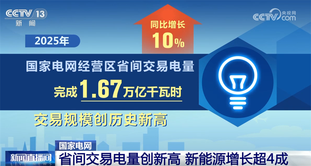 (文章来源:央视新闻) 记者从国家电网了解到,2025年国家电网经营区省间交易电量完成1.67万亿千瓦时,同比增长10%,交 易规模创历史新高。其中,省间新能源交易电量完成3177亿千瓦时、同比增长41%。 ...