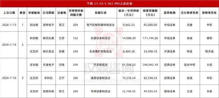 IPO及再融资上会预告 据交易所官网审核动态信息,下周(1月12日-1月16日)IPO上会审核6家企业,合计拟募资66.32亿元。 | | | | | | | 下周(1.12-1.16) IPO上会企业 | | | | | | | --- | --- | --- | --- | --- | --- | --- | --- | --- | --- | --- | --- | | 上会日期 | 数量 | 申报板块 | 公司简称 | 注册地 | 受理到审核 间隔天数 | 所属行业 | 最近一年净利润 (万元) | 拟募资规模 (万元) | 保荐机构 | 会计师事务所 | 律师事务所 | | 2026-1-13 | 1 | 创业板 | 高特电子 | 浙江 | 204 | 电气机械和器材制造业 | 9,842.23 | 85,000.00 | 中信证券 | 天健 | 中伦 | | 2026-1-14 | 2 | 科创板 | 联讯仪器 | 江苏 | 152 | 仪器仪表制造业 | 14,088,30 | 171,144,28 | 中信证券 | 器波 | 德恒 | | | | 北交所 | 瑞尔竞达 | 安徽 | 244 | ...