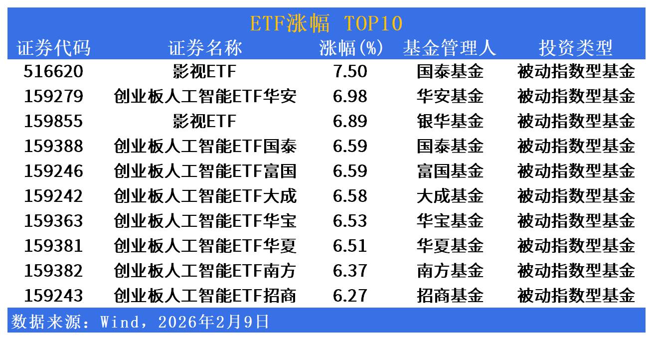 Market Overview - The A-share market saw a collective rise in the three major indices, with the Shanghai Composite Index recovering the 4100-point mark, closing up 1.41% [1] - The total trading volume in the Shanghai, Shenzhen, and Beijing markets reached 2.27 trillion yuan, an increase of 106.7 billion yuan compared to the previous trading day [1] ETF Performance - The film and AI ETFs led the market with significant gains, with the Guotai Film ETF (516620) surging 7.50% and the Huazhang AI ETF (159279) rising 6.98% [2] - Other AI-related ETFs also performed well, with several exceeding a 6.50% increase, indicating strong investor interest in AI applications and computing infrastructure [2] - The new energy sector also showed positive movement, with the Invesco Battery ETF (159757) up 2.20% and the Fortune Lithium Battery ETF (561160) rising 2.12% [2] ETF Declines - Commodity and bond ETFs experienced slight adjustments, with the maximum decline being less than 0.1%, indicating a stable market environment [3][4] Trading Activity - The Short-term Bond ETF (211360) had a trading volume of 52.734 billion yuan, leading the market, followed by the Yin Hua Daily ETF (211880) at 17.104 billion yuan [5][7] - The Huaxia Brazil ETF (159100) had a turnover rate of 211.93%, reflecting a high level of speculative trading in cross-border products [6][7] New ETF Launch - The E Fund Shanghai Composite Index ETF (530060) is set to launch on February 10, 2026, with 321 million shares issued, tracking the overall performance of stocks listed on the Shanghai Stock Exchange [8]