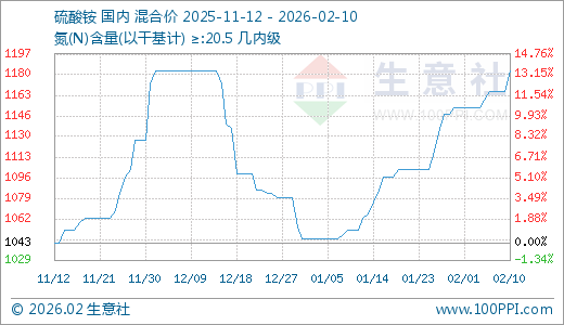 02月10日硫酸铵1183.33元/吨 30天上涨12.34%