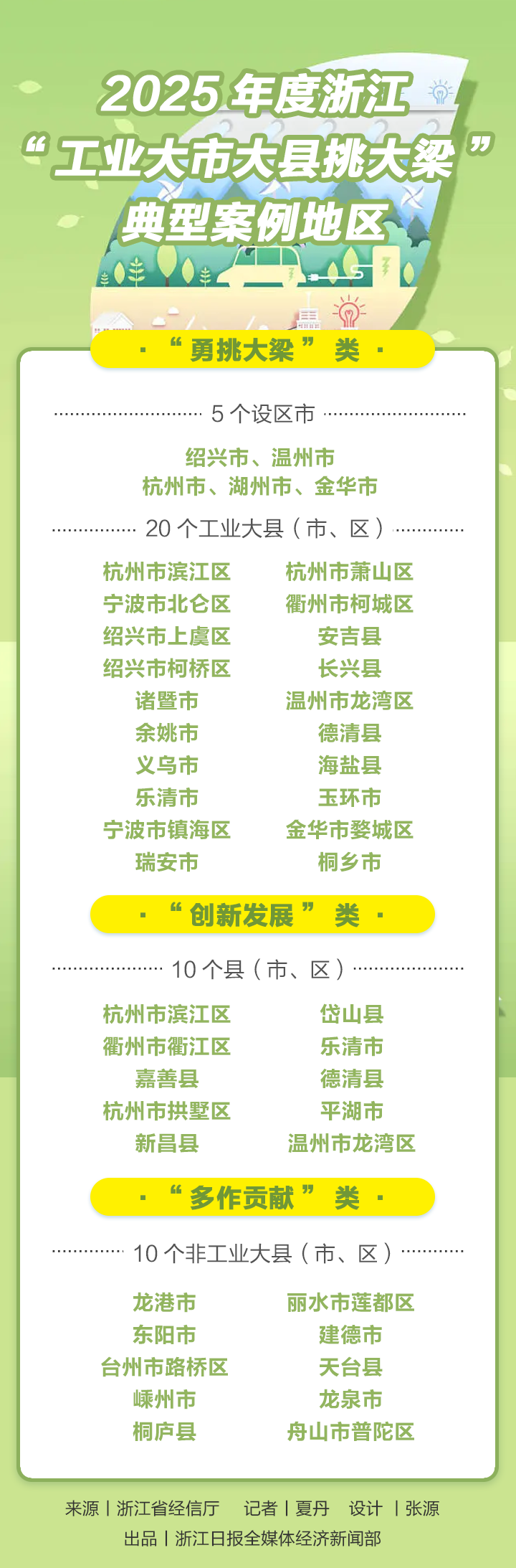 数据显示,去年1-11月,5个大市、20个县(市、区)分别对全省增长贡献率达到58.5%、52.6%,真正发挥了勇挑大梁的担当。 勇挑大梁 工业经济是经济发展的"压舱石",工业大市大县(市、区)则是发展工业经济的核心力量。 截至目前,浙江共有45个工业大县(市、区),刚好是全省90个县(市、区)的一半。 在中国,经济大省挑大梁;在浙江,则是工业大市大县挑大梁。 记者从省经信厅了解到,通过对11个设区市、45个工业大县的综合评价,分别选出5个大市、20个县(市、区),上榜年度"勇挑大梁"。 浙江省委书记王浩曾多次调研工业大市大县,还在去年10月召开的县(市、区)委书记工作交流会上强调,推动工业稳进增效,抓好工业大市大县和重点 行业企业,持续推进"415X"先进制造业集群建设,做好企业梯度培育和提升发展工作,切实发挥好工业"压舱石"作用。 过去一年,工业大市大县发展成效如何?1月8日,浙江省经信厅发布了2025年度"工业大市大县挑大梁"典型案例,分为"勇挑大梁""创新发展""多作贡 献"三个评价维度。"榜上有名"都有谁,记者和您一起看个究竟。 除了大市,记者还注意到,20个上榜的工业大县(市、区)中,有8个地区规 ...