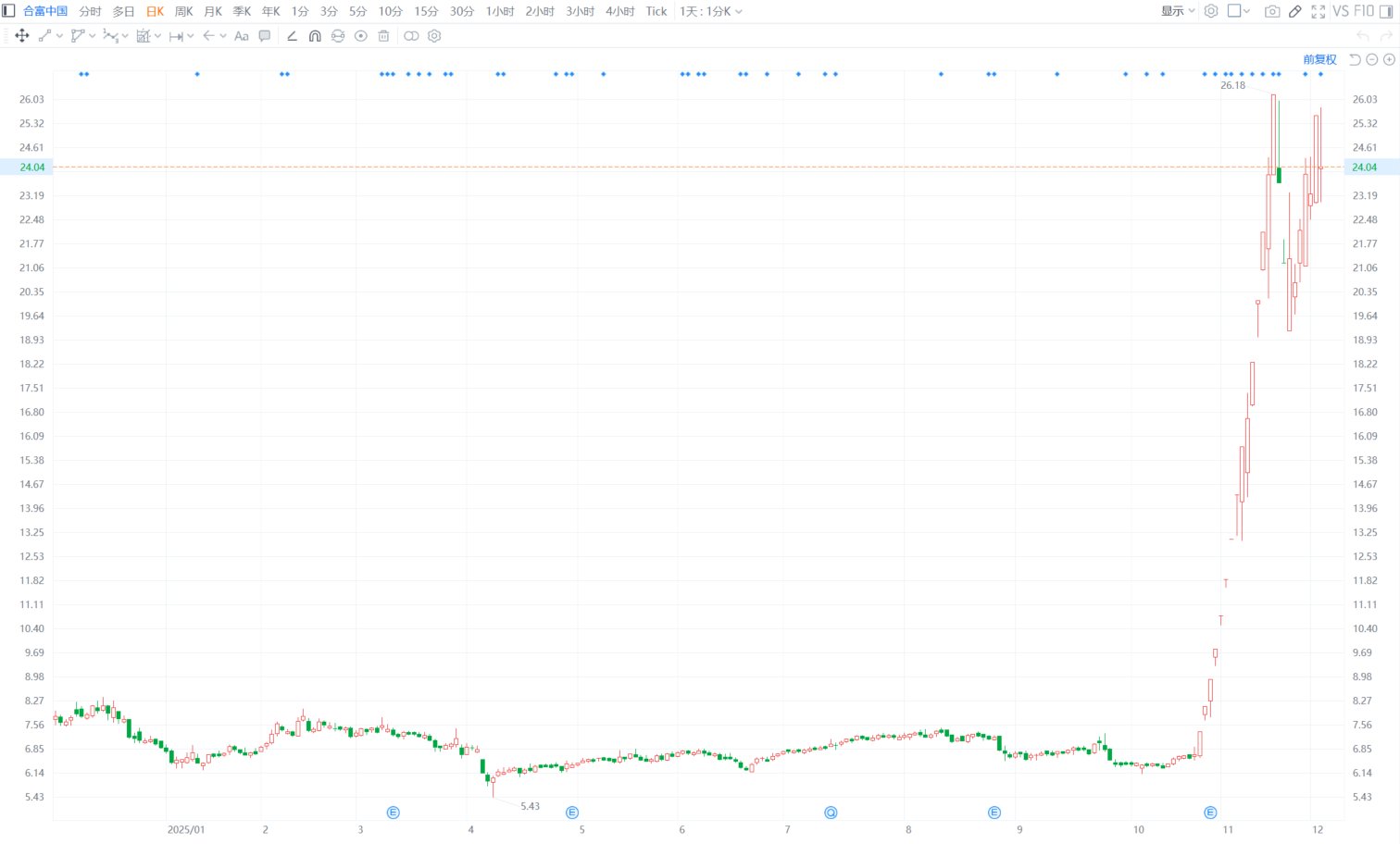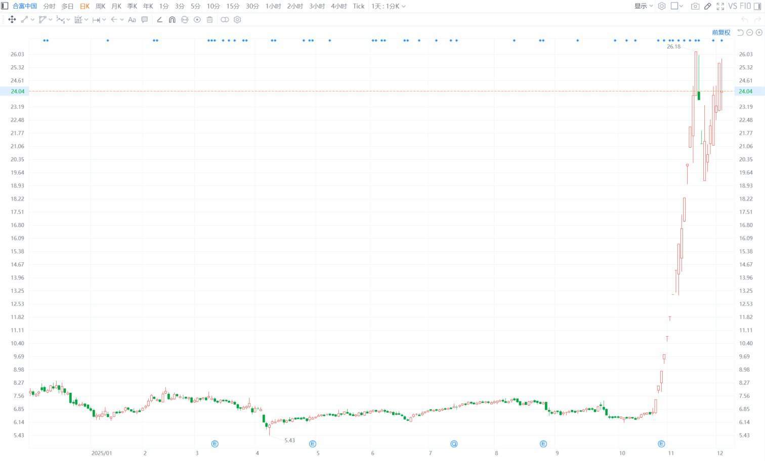 格隆汇12月3日|合富中国现跌6.26%报23.96元,暂成交17亿元,最新市值95.4亿元。合富中国公告,控股股东合富香港拟自公告日起15个交易日后的3个月 内,通过大宗交易及集中竞价合计不超796.11万股(2%),减持价格将视市场情况确定,所减持股份均为IPO前取得的无限售流通股,拟用于充实运营资金, 含股东开展磁振造影即时导航放射治疗系统设备项目等产生的资金需求。(格隆汇) | | .. | | .. | | .. | | | .. | .. | | | | | | --- | --- | --- | --- | --- | --- | --- | --- | --- | --- | --- | --- | --- | --- | | 26.03 | | | | | | | | | | | | | | | 25.32 | | | | | | | | | | | | | | | 24,61 | | | | | | | | | | | | | | | /24.04 | | | | | | | | | | | | | | | 23.19 | | | | | | | | | | | | | | | 22,48 ...