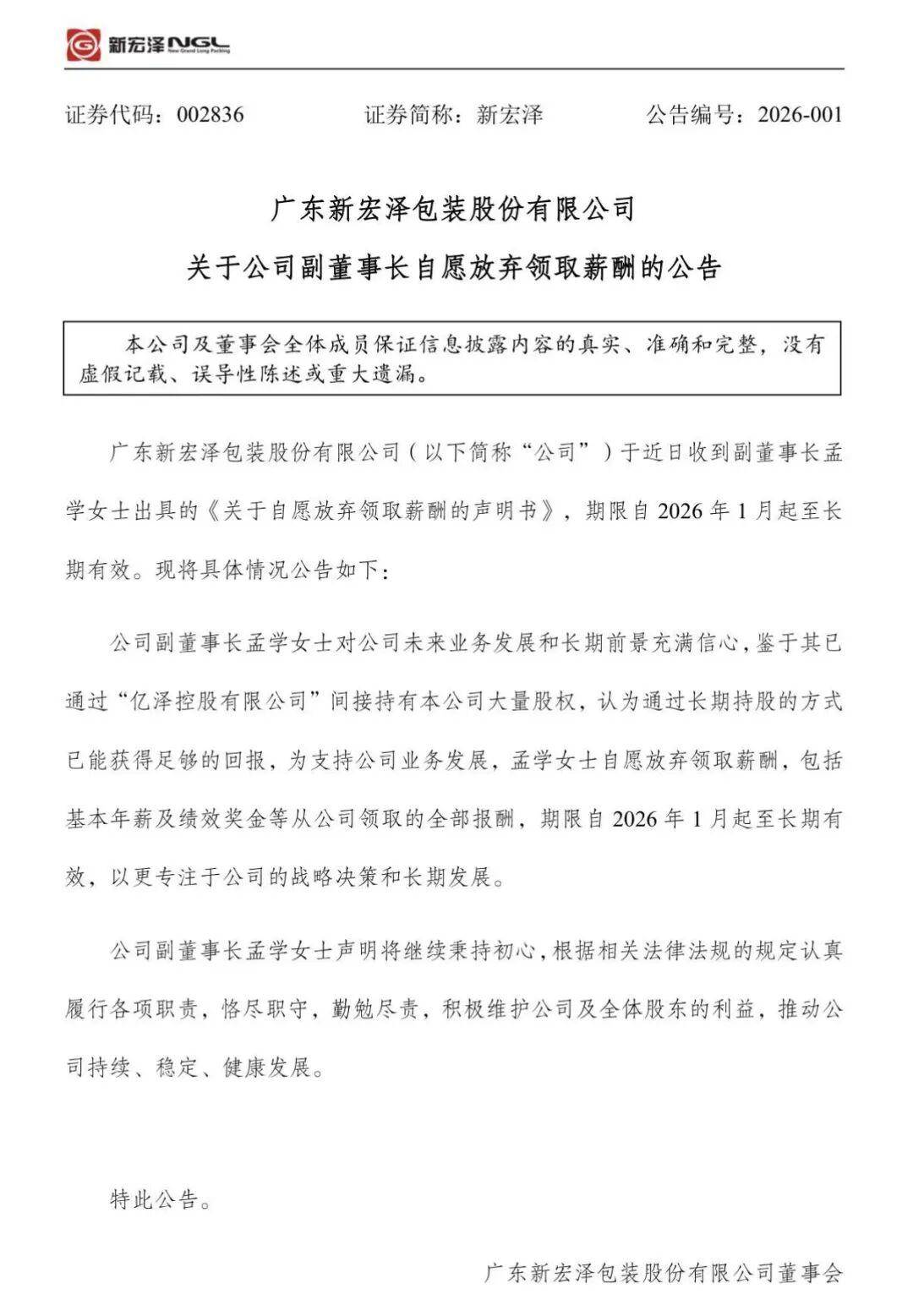 1月7日,上市公司新宏泽公告称,公司副董事长孟学对公司未来业务发展和长期前景充满信心,鉴于其已通过"亿泽控股有限公司"间接持有本公司大量股 权,认为通过长期持股的方式已能获得足够的回报,为支持公司业务发展,孟学自愿放弃领取薪酬,包括基本年薪及绩效奖金等从公司领取的全部报酬, 期限自2026年1月起至长期有效,以更专注于公司的战略决策和长期发展。 证券代码:002836 证券简称:新宏泽 公告编号:2026-001 广东新宏泽包装股份有限公司 关于公司副董事长自愿放弃领取薪酬的公告 本公司及董事会全体成员保证信息披露内容的真实、准确和完整,没有 虚假记载、误导性陈述或重大遗漏。 广东新宏泽包装股份有限公司(以下简称"公司")于近日收到副董事长孟 学女士出具的《关于自愿放弃领取薪酬的声明书》,期限自2026年1月起至长 期有效。现将具体情况公告如下: 公司副董事长孟学女士对公司未来业务发展和长期前景充满信心,鉴于其已 通过"亿泽控股有限公司"间接持有本公司大量股权,认为通过长期持股的方式 已能获得足够的回报,为支持公司业务发展,孟学女士自愿放弃领取薪酬,包括 基本年薪及绩效奖金等从公司领取的全部报酬,期限自202 ...