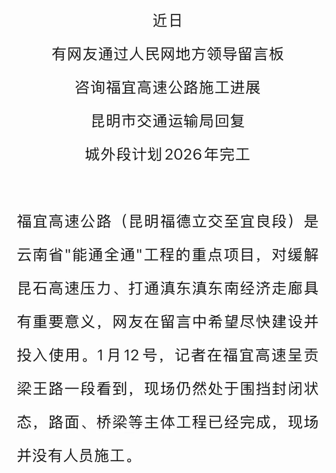 近日 有网友通过人民网地方领导留言板 咨询福宜高速公路施工进展 昆明市交通运输局回复 城外段计划 2026年完工 福宜高速公路(昆明福德立交至宜良段)是 云南省"能通全通"工程的重点项目,对缓解 昆石高速压力、打通滇东滇东南经济走廊具 有重要意义,网友在留言中希望尽快建设并 投入使用。1月12号,记者在福宜高速呈贡 梁王路一段看到,现场仍然处于围挡封闭状 态,路面、桥梁等主体工程已经完成,现场 并没有人员施工。 市民:"修好肯定好一点,路要好一点,修 好了这边就干干净净的,环境就好了嘛。那 边路确实不太好,全是坑坑洼洼的,尽快修 好,对于出行就更好一些。" 来源:YNTV2都市条形码版权归原作者所有,如有侵权请联系我们及时处理。 市民:"好像停工半年了,这样就是看着不 太干净,环境有点脏,看着不舒服,希望它 99 赶紧修好, 我们在家里看着也舒服点。 锁导留言服 话题 人民日报读者来信 政企直通车 社会工作 全过程人民民主案例库 云南省昆明市委书记刘洪建 加快福宜高速的建设 留言ID:24220589 2025-11-30 19:08 福宜高速公路(昆明福德立交至宜良段)是云南省"能通全通"工程的重点项目,对 ...