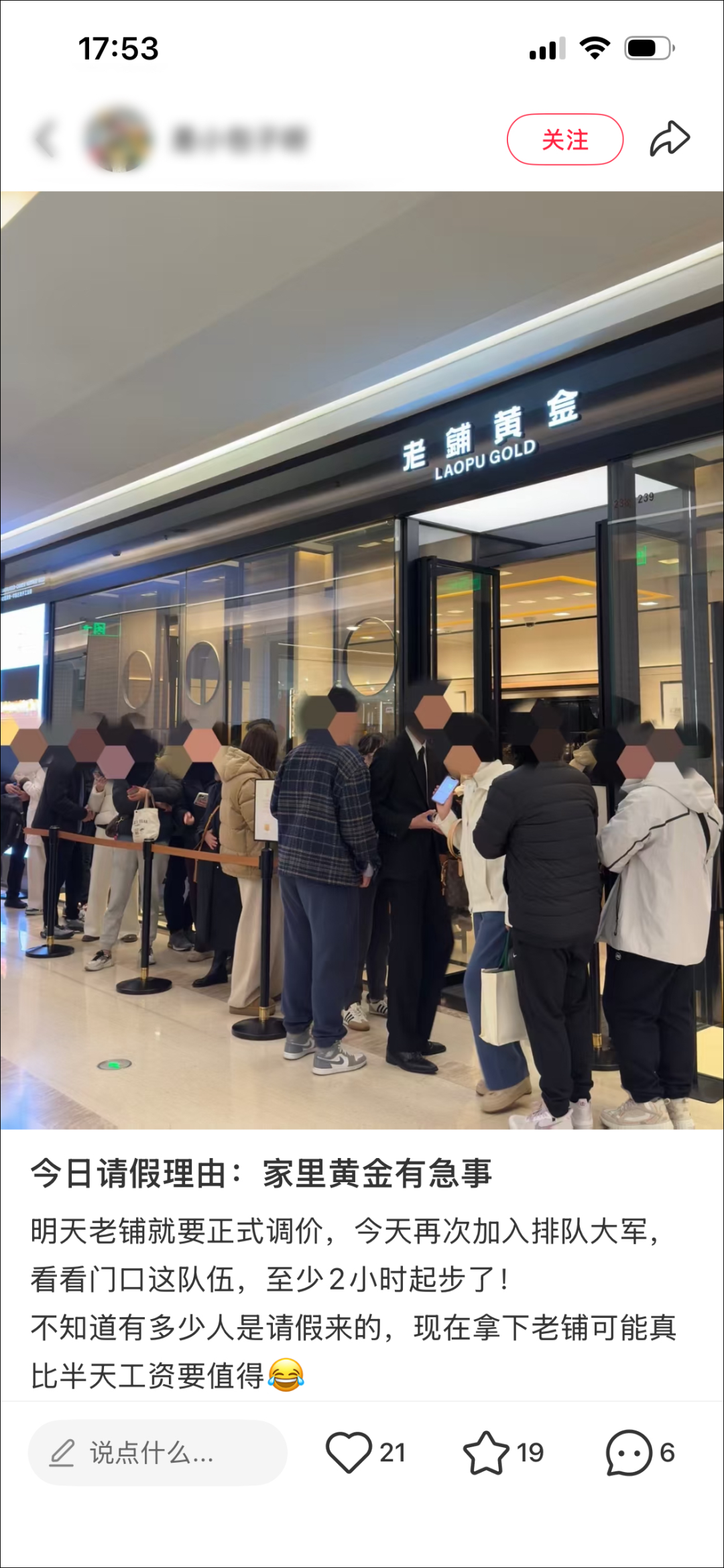老铺黄金新年首次调价前日,有人班都不上了排队抢金,网店1分钟卖出3亿元