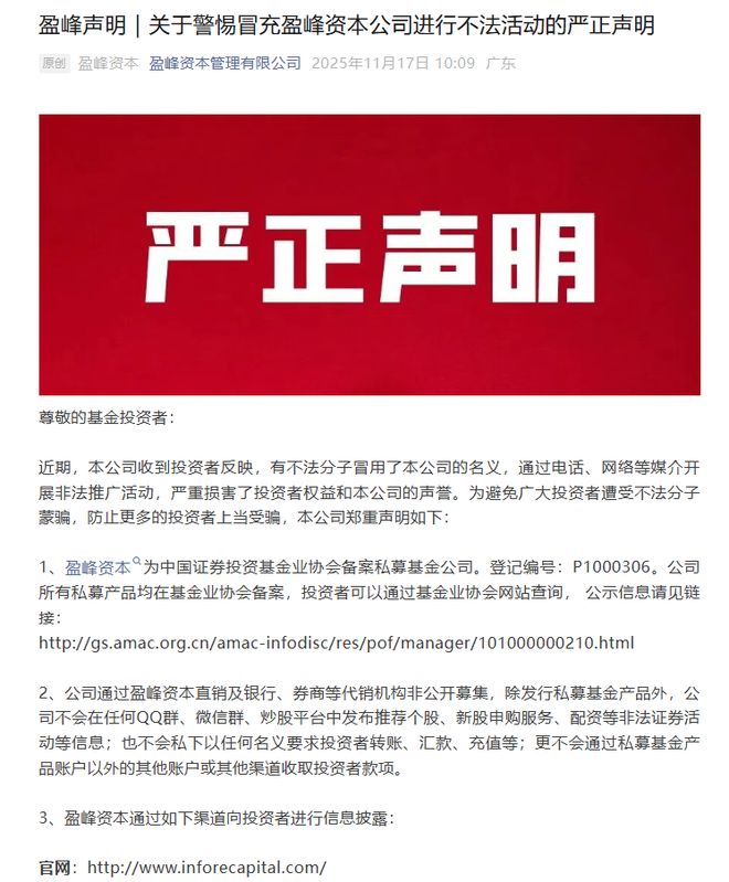遭冒名开展非法活动,百亿私募盈峰资本严正声明:已取证