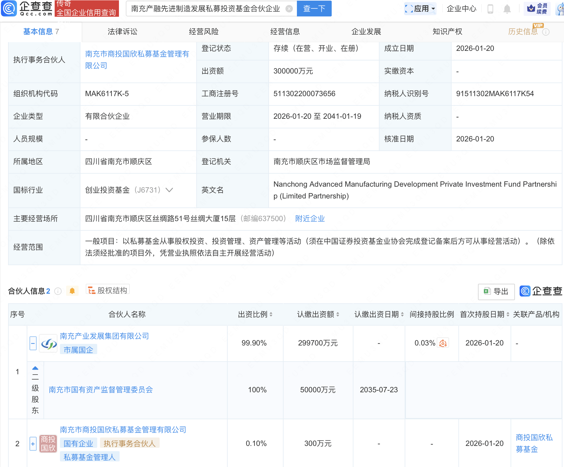 Group 1 - Nanchong Advanced Manufacturing Development Private Investment Fund Partnership has been established with a total investment of 3 billion yuan [1] - The fund's business scope includes private equity investment, investment management, and asset management activities [1] - The fund is co-funded by Nanchong Industrial Development Group Co., Ltd. and others [1] Group 2 - The fund is registered as a limited partnership and is located in Nanchong City, Sichuan Province [2] - The fund's operational period is from January 20, 2026, to January 20, 2041 [2] - Nanchong Industrial Development Group Co., Ltd. holds a 99.90% stake in the fund, contributing 2.997 billion yuan [2]