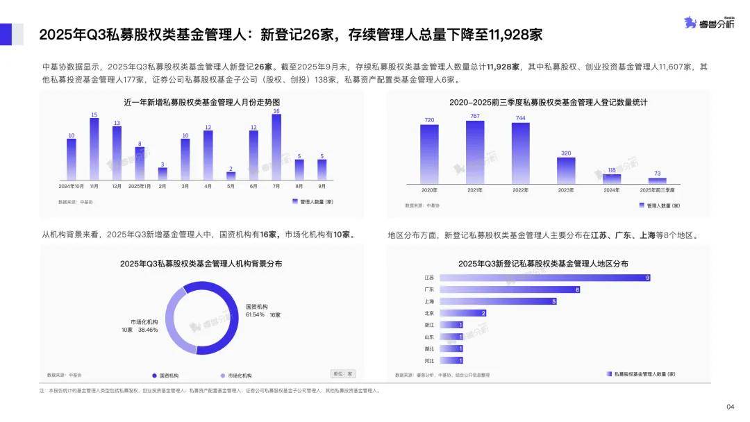 以下文章来源于睿兽Pro ,作者Bestla 睿兽Pro . 创业邦旗下横跨一二级市场的科创数据平台。实时投资数据、追踪产业创新。找数据、做分析、链资源,就上睿兽分析。 ● 私募股权类基金管理人新登记 26 家,存续管理人总量下降至 11,928 家 ● 新增基金数量稳定增长,新增备案私募股权类基金 1,366 只,披露认缴规模 5,530.59 亿人民币 ● 浙江新增基金数量领跑(共计 298 只),规模显著领先(合计 1,004.74 亿元) ● 嘉兴、青岛、苏州三城新备案基金数量最多;北京、上海、杭州位列全国吸金前三甲 ● 共计 990 家机构新增备案私募股权类基金,机构参与数量较上年同期增加 26.11% ● 机构 LP 贡献超九成募资,国资背景 LP 占据主导地位 ● 机构 LP 城市版图:北京、上海机构 LP 出手次数均为 239 次,并列全国第一 ● 共 113 只新备案基金穿透涉及 127 家上市公司 LP 参与,出资规模达 163.01 亿元 2025年Q3新增备案私募股权类基金1,366只,披露认缴规模5,530.59亿人民币 基金披露认缴规模 单只基金平均认缴规模 新备案基金数量 同比 ...