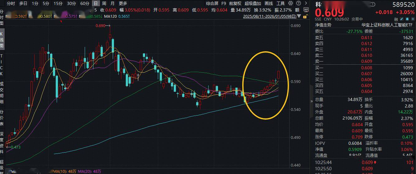 迎来补涨行情?2026年第一个交易日(1月5日)重点布局国产AI产业链的科创人工智能ETF华宝 (589520)强势上攻,场内涨幅最高上探4.91%,收涨4.74%,收盘涨幅刷新去年8月以来的新高,盘中 最高价(0.620)再创去年10月以来的高点。值得关注的是,该ETF近7个交易日中,有6个交易日上 涨,日k线或已走出"上行台阶"。 | 序号 | 名称 | 液肤幅, | 两日图 | 申万一级行业 | 申万二级行业 | 甲万三级行业 | 总市值 | 成交额 | | --- | --- | --- | --- | --- | --- | --- | --- | --- | | | 复目微电 | 12.59% | | 电子 | 新局体 | 数字芯片设计 | 5764Z | 27.78亿 | | 2 | 优刻得-W | 936% | wine | 计算机 | IT服务II | IT服务Ⅲ | 140Z | 22.15 亿 | | 3 | 福昕软件 | 8.84% | Must | 计算机 | 软件开发 | 横向通用软件 | 891Z | 5.874Z | | 4 | 思看科技 | 8.69% | 100 - 100 ...