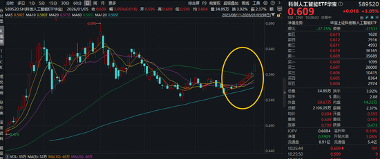 迎来补涨行情?2026年第一个交易日(1月5日)重点布局国产AI产业链的科创人工智能ETF华宝 (589520)强势上攻,场内涨幅最高上探4.91%,收涨4.74%,收盘涨幅刷新去年8月以来的新高,盘中 最高价(0.620)再创去年10月以来的高点。值得关注的是,该ETF近7个交易日中,有6个交易日上 涨,日k线或已走出"上行台阶"。 | 序号 | 名称 | 所時代 | 两日图 | 申万一级行业 | 申万二级行业 | 申万三级行业 | 总市值 | 成交额 | | --- | --- | --- | --- | --- | --- | --- | --- | --- | | 1 | 复目積电 | 12.59% | | 电子 | 未曾体 | 数字芯片设计 | 576亿 | 27.78亿 | | 2 | 优刻得-W | 9.36% | State No a | 计算机 | IT服务Ⅱ | IT服务Ⅲ | 140亿 | 22.154Z | | 3 | 福昕软件 | 8.84% | ac - proven | 计算机 | 软件开发 | 横向通用软件 | 89亿 | 5.87 亿 | | 4 | 思看科技 | 8.69% ...